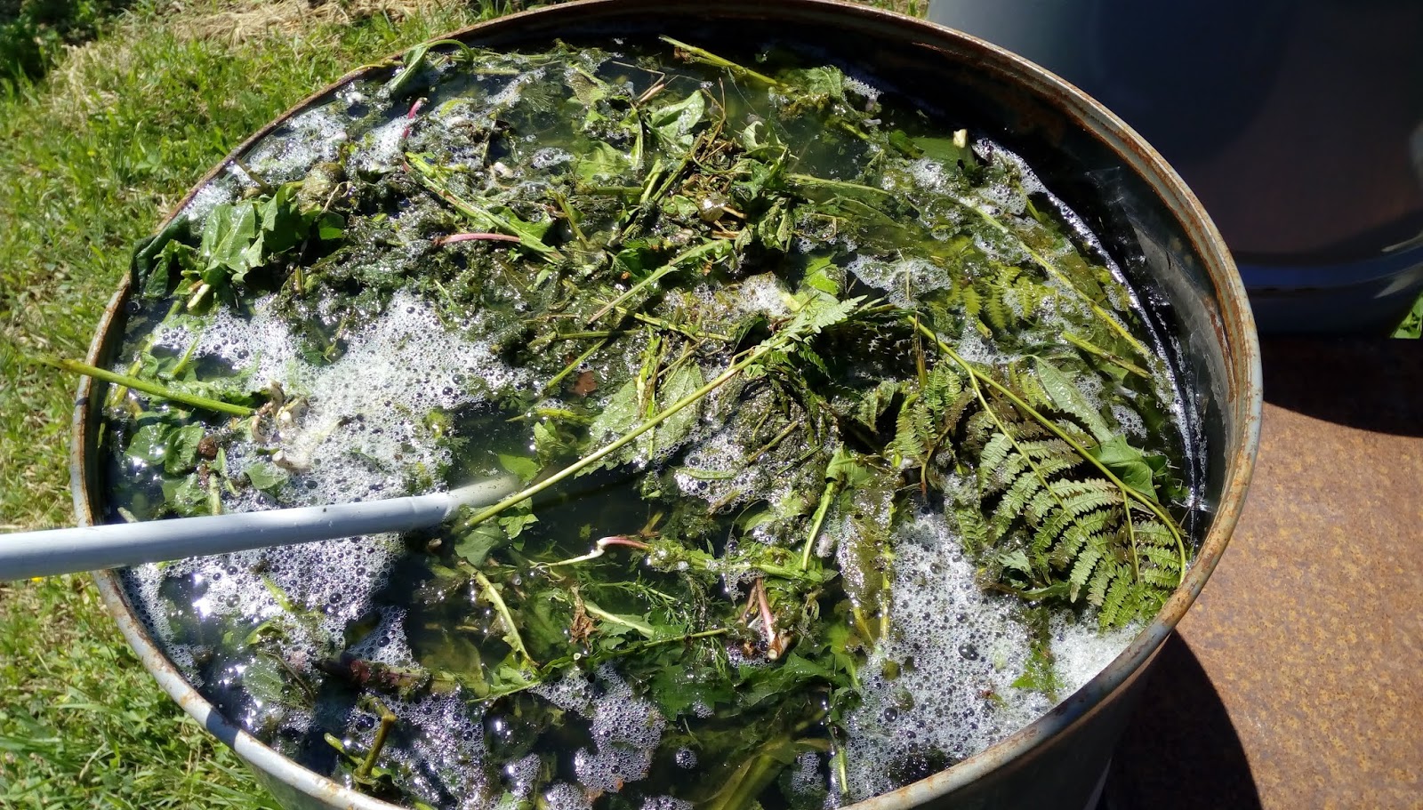 U velikom buretu nalaze se bujad, kopriva, gavez, hajdučka trava i maslačak. Nakon nekoliko dana i povremenog miješanja, kada prestane da pjeni, tečnost je spremna za upotrebu. Omjer za razrjeđivanje s vodom može biti 1:10 a i više, čak i 5:10. Važno je da su biljke jače, list je jači, zelen i čak djeluje odbijajuće na štetnike jer neugodan miris tjera ljude a kamoli insekte.